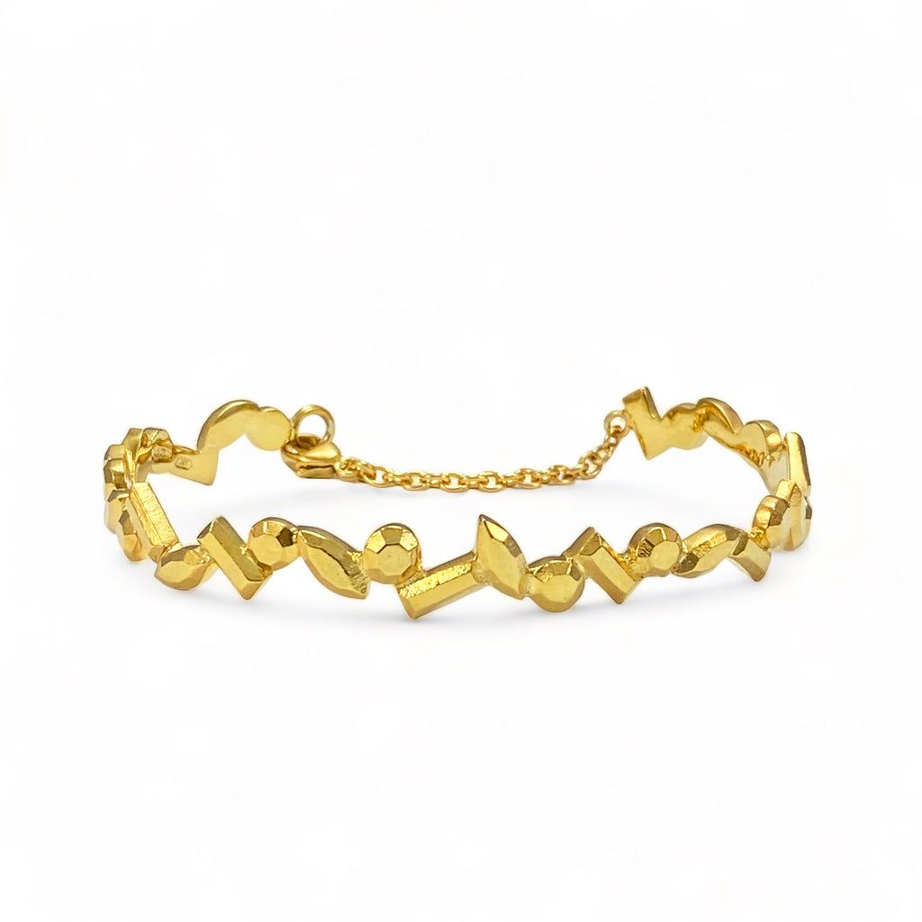 The Ava Gold Cuff features our signature faceted shapes. It's a playful and modern take on a traditional cuff. It fastens securely at the back with a clasp.
