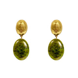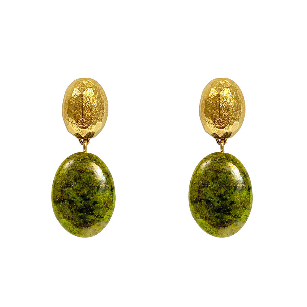 The textured and faceted gold ovals beautifully catch the light, and nicely contrast with the smooth deep green serpentine ovals.
