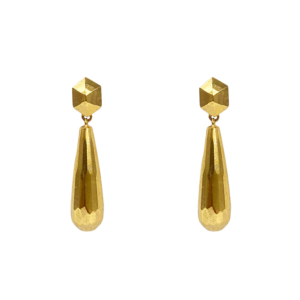 This elegant pair of statement earrings shows a unique texture. The facets of the geometric shapes beautifully catch the light, and will frame your face with a golden glow.