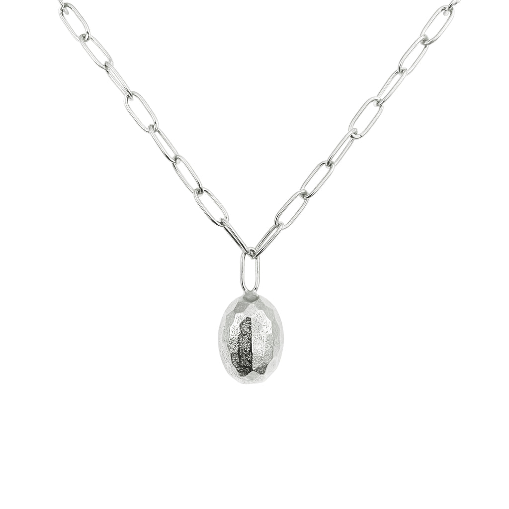 Simple, beautifully textured and tactile, its facets nicely catch the light, and its length makes it the perfect pendant to layer with other chains and necklaces.