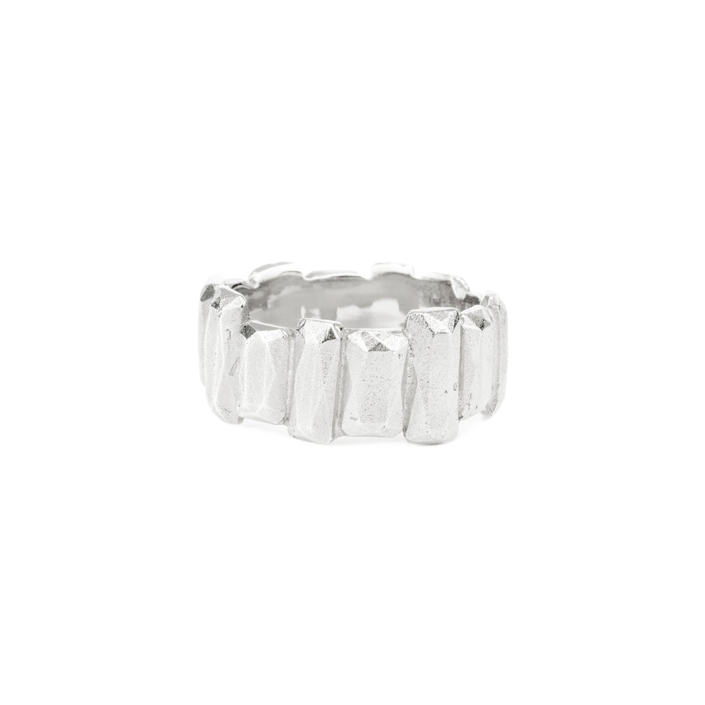 The Luci ring is a graphic and detailed modern piece with an antiqued look. Its texture and asymmetric cut make it the perfect piece to complement with style any outfit.